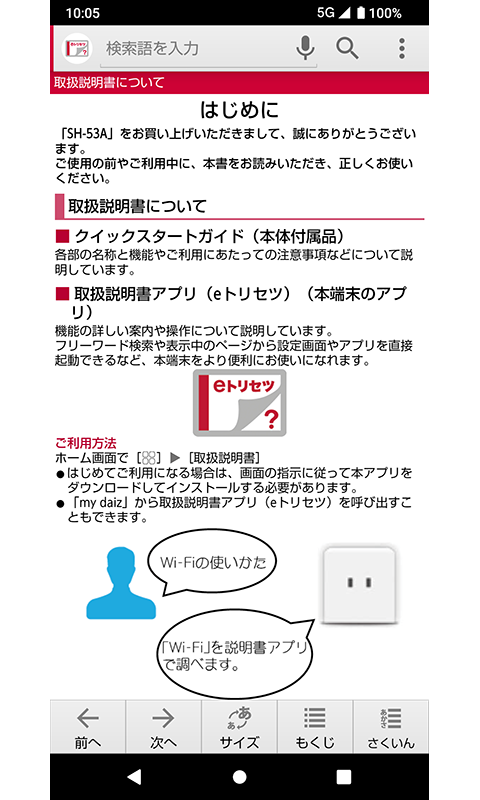 Sie können nicht nur die Bedienungsanleitung anzeigen, sondern den SH-53A auch bequemer verwenden, indem Sie nach freien Wörtern suchen und Einstellungsbildschirme und Apps direkt von der angezeigten Seite starten.