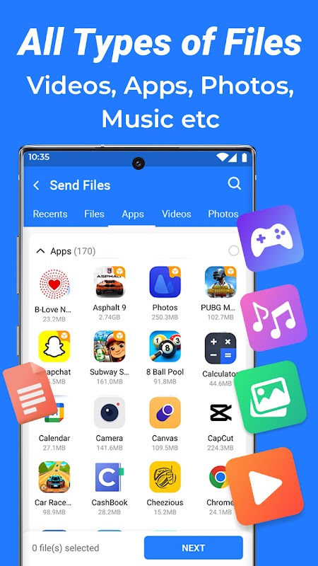 ALLES TEILEN: Dateiübertragung und Dateifreigabe App-Freigabedateien von Gerät zu Gerät ohne Kabel übertragen. Kein Internet? Kein Problem, Sie können Videos, Audio, Fotos und Dateien mit Freunden in der Nähe teilen. Die beste Funktion von „Alle teilen“ ist, dass Sie Dateien separat oder in Form eines Buckets teilen können.