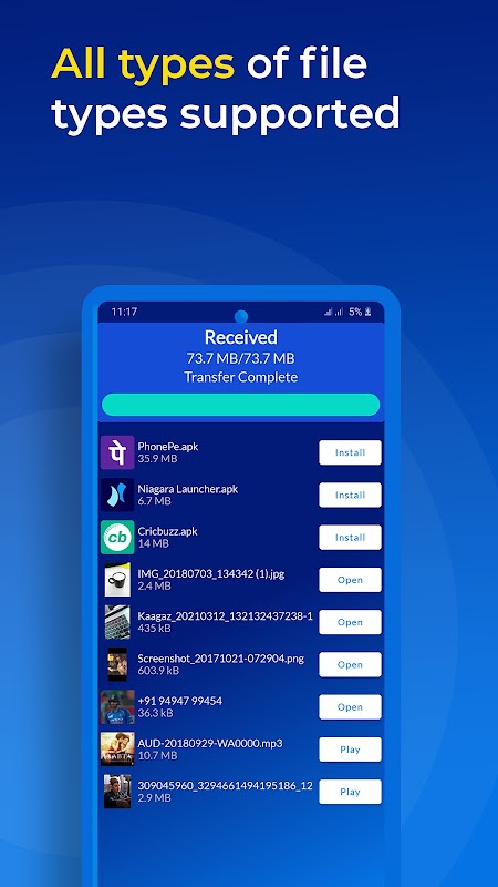 📁 Unterstützt alle Dateitypen: Teilen Sie ganz einfach PDFs, ZIP-Dateien, Apps, Kontakte, Fotos, Musik und sogar APK-Dateien.