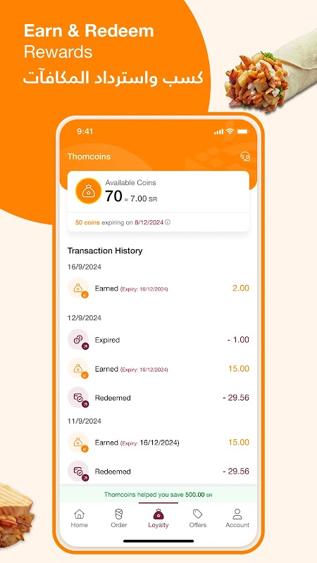 - Sammeln Sie Punkte mit dem Thomcoins-Treueprogramm. Melden Sie sich bei Ihrem Konto an, um einen Liefer- oder Abholauftrag aufzugeben und Punkte über das Thomcoins-Treueprogramm in der App zu sammeln. Sie können Ihre gesammelten Punkte gegen tolle Rabatte einlösen!