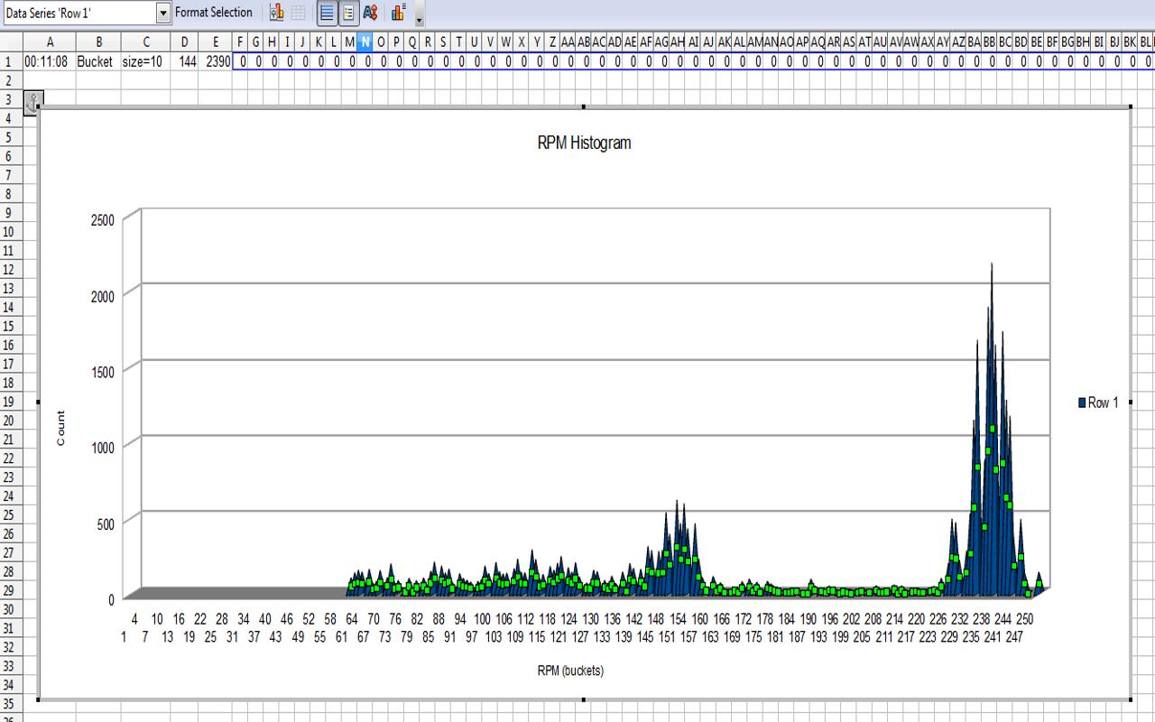 Data logging! Use simple screen touch to start and stop data logging for later analysis. Data is collected as a histogram of RPM values. Bucket size is 10. Number of buckets depends on entered shift RPM value.