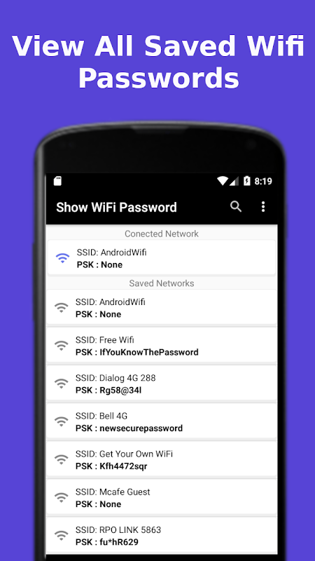 Möglicherweise müssen Sie die Kennwörter der gespeicherten WLAN-Verbindung anzeigen, wenn ein neues Gerät zur Verbindung hinzugefügt werden muss und Sie keinen einfachen Zugriff auf das Kennwort haben, oder es gibt viele andere mögliche Ursachen. Bei all diesen Ereignissen macht es Show Wifi Password ganz einfach, mit einem Fingerdruck Verbindungskennwörter mit anderen zu teilen oder sie sich selbst anzusehen.