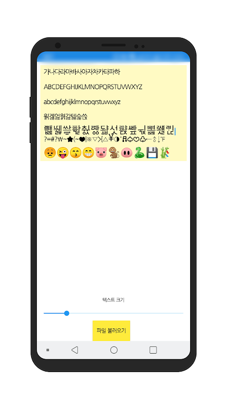 이 앱은 트루타입 글꼴(*.ttf) 폰트를 적용시킨 글자를 보여줍니다. 폰트의 글자 크기와 지원하는 언어 및 특수문자를 볼 수 있습니다.