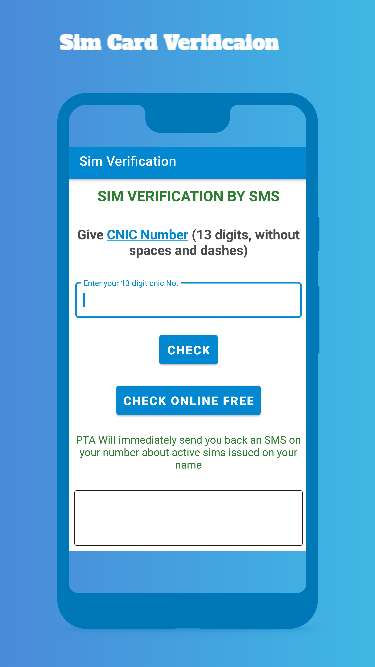 In this sim verification app you can enter your id card number to verify how many sims are registered on your name. You can also check by sms or online.In Sim verification app you can simply enter your cnic card number and check how many sims are biometric verified on your cnic number.