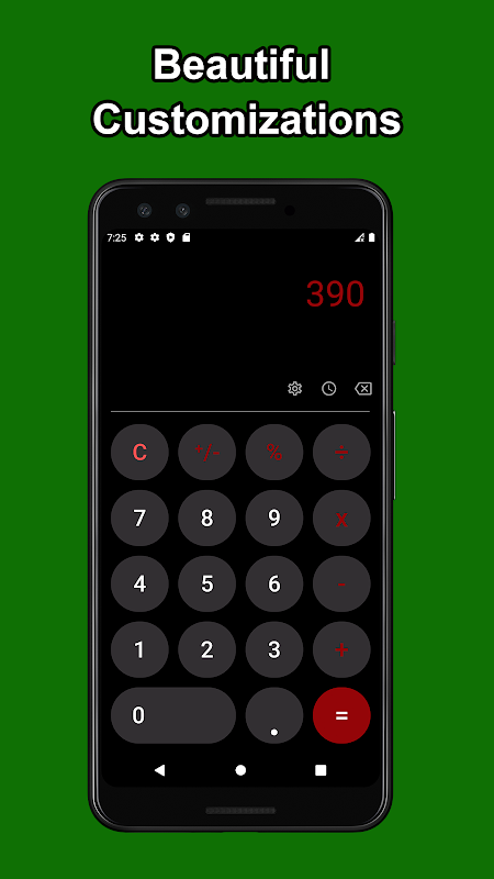 Die App ist ein einfacher Helfer für schnelle Berechnungen mit vielen Grundfunktionen wie Multiplizieren, Dividieren, Wurzel und Potenzen. Es kommt auch mit einem dunklen Thema, so dass Sie diese neue Technologie verwenden können, um Ihren Taschenrechner glatter und benutzerfreundlicher aussehen zu lassen, anstatt scharfe Farben zu verwenden, die in verschiedenen Taschenrechnern bereitgestellt werden, die Ihnen nicht helfen können, sich auf Ihre komplexen Berechnungen in diesem mathematischen Taschenrechner zu konzentrieren. Sie können es auf Knopfdruck vibrieren lassen, um Sie beim Einfügen Ihrer Werte sicher zu machen. Die exquisiten Farben, die in dieser App verwendet werden, sind cool und sehen für die Augen glatt aus, sodass Sie leicht zwischen allen Schaltflächen unterscheiden und problemlos rechnen können. Dieser Rechner kann verwendet werden, um komplexe Wurzelprobleme zu lösen, oder er kann auch als Währungsumrechner oder Grafikrechner verwendet werden. Sie können auf einen Verlauf der Vorgänge zugreifen, um schnell die letzten Berechnungen zu durchsuchen. Es wird standardmäßig mit Materialdesign und dunklem Design geliefert und bietet eine hervorragende Benutzererfahrung für eine einfache Verwendung. Der fehlende Internetzugang bietet Ihnen mehr Privatsphäre, Sicherheit und Stabilität als andere Apps. Dieser einfache Rechner ist ein bester Rechner. Es ist eine der umfassendsten Taschenrechner-Apps überhaupt - intelligenter Taschenrechner, schneller Taschenrechner. Dies ist der beste Basisrechner für Ihr Android-Handy. Sie können die Farben des einfachen Taschenrechners ganz einfach nach Ihren Wünschen ändern.