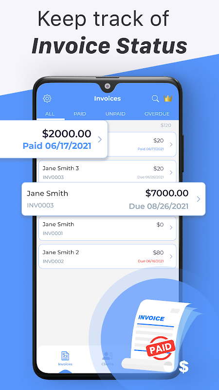 Simple Invoice Maker & Receipt Generator ist eines der bequemsten Finanzinstrumente für Unternehmer, Freiberufler oder Heimarbeitgeber. Es hilft Ihnen, Schätzungen zu erstellen, Rechnungen zu senden, den Rechnungsstatus zu verfolgen und Ihren Kunden überall und jederzeit nur über ein Telefon zu erinnern.