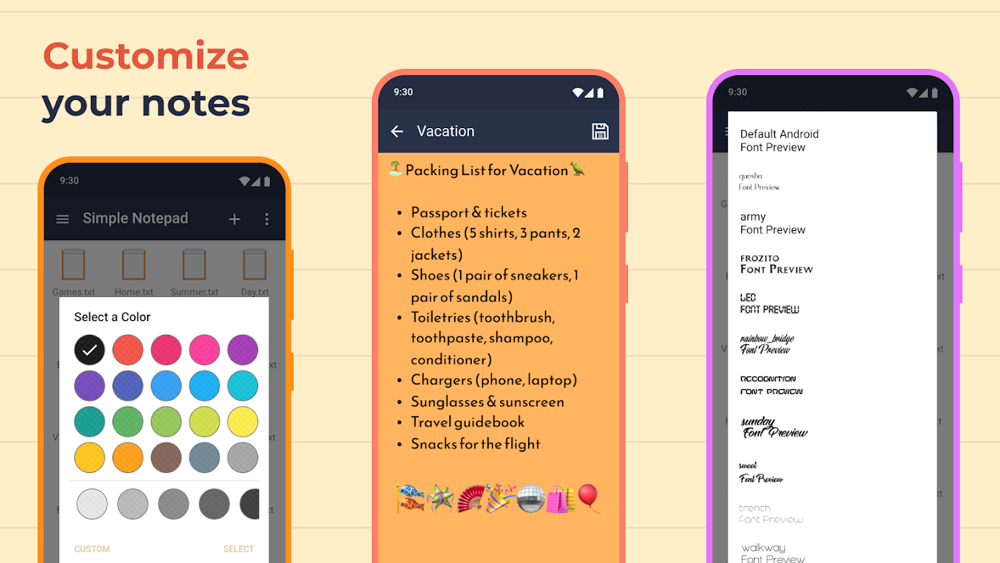 Passen Sie Ihre einfache Notizen-App nach Ihren Wünschen an, indem Sie Schriftarten, Textgrößen, Hintergründe und Farben ändern. Erstellen Sie genau den richtigen Notizblock für Android. Machen Sie Ihre einfache Notiz zu etwas Besonderem, indem Sie nur den Text oder den Hintergrund ändern und so die Notizen visuell gruppieren. Perfekt ausgewogene Einfachheit und Flexibilität!