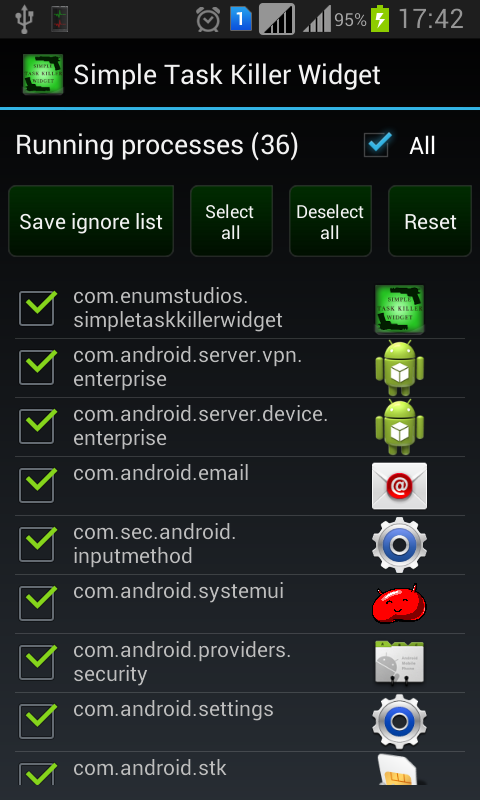 In "Ignored List" you can choose the tasks that you don't want Simple Task Killer Widget to kill. You may also check "All" option to kill EVERY background task, no matter what!