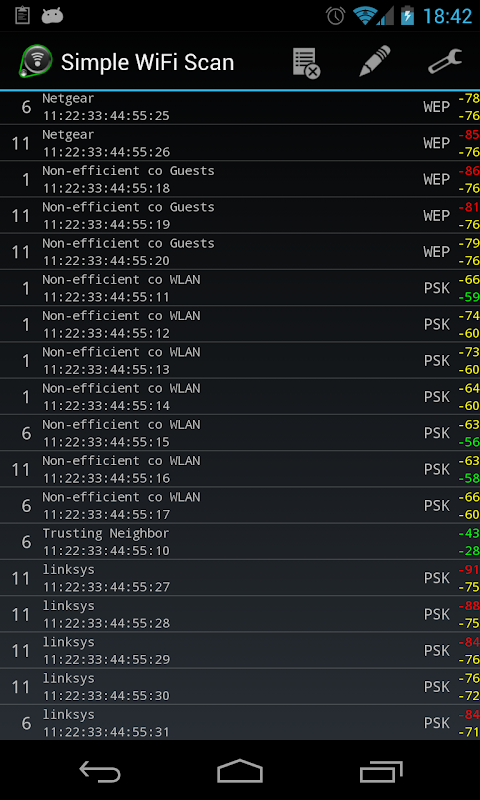 Zeigt alle verfügbaren Scan-Daten: SSID, BSSID, Kanal, Sicherheit, WPS-Status und Signalstärke. Best / Stromsignal wird angezeigt, so dass Zugangspunkte können schnell lokalisiert werden.