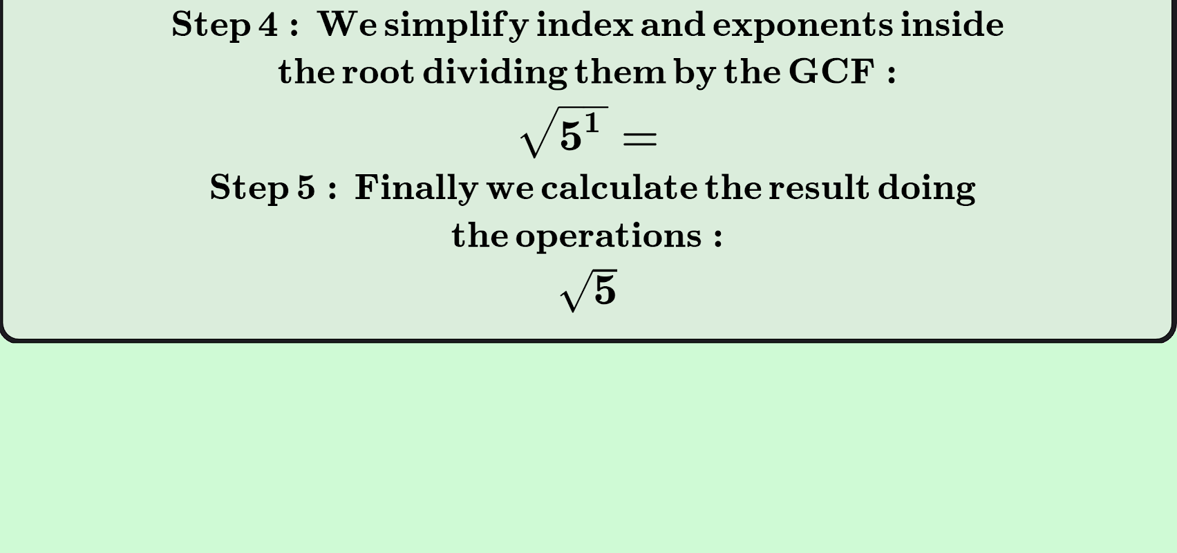 The steps to achieve the simplification are: extract factor outside the root and divide the index and the exponents by the same number (using power properties).