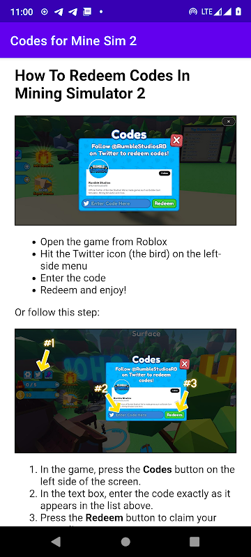 However, the easiest way to get new codes is to install this Codes for Mining Simulator 2 apps and check back if you notice there has been an update to the game. We do all the tedious work for you so you don't have to monitor Twitter or Discord for codes, and they're added to the apps as soon as they're available!
