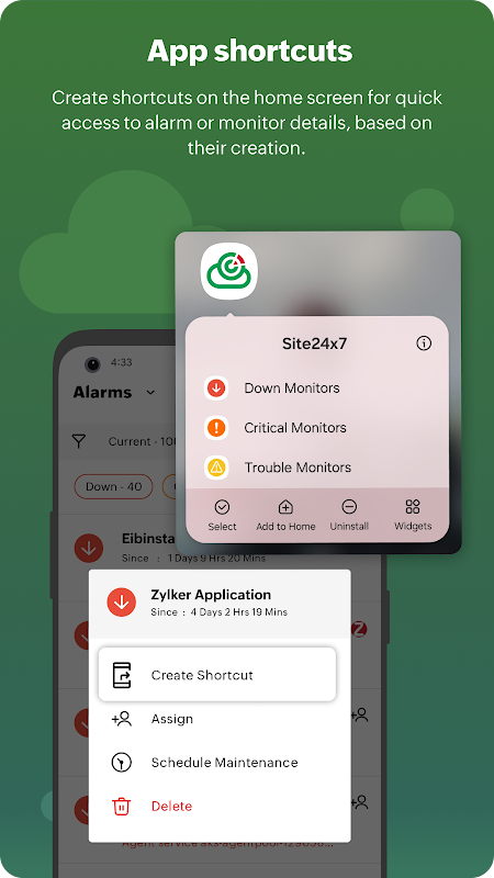Erhalten Sie Ausfallverläufe und Leistungsberichte für Ihre Monitore. Verwalten Sie mehrere Konten über Domänen hinweg und verfolgen Sie den Zustand Ihres Systems mithilfe von Widgets wie Alarmen und Status. Mithilfe von Alarmverknüpfungen können Sie direkt über den Bildschirm auf den Alarm zugreifen. Weisen Sie schnell Techniker für eine schnellere Lösung zu und erstellen Sie Verknüpfungen zur einfachen Überwachung mehrerer Alarme.