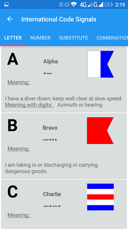- ICS-Flaggen mit lateinischem und Gerke (Morze) -Alphabet, Flaggenmaenings, Codes der Hauptflaggenkombinationen. Die Informationen entsprechen dem ICS-1969 von 2015.