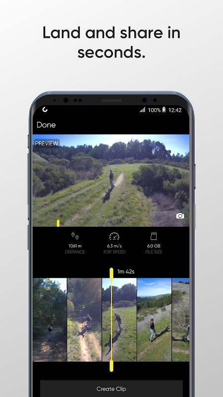 Sobald R1 landet, können Sie einen Clip Ihres Abenteuers mit synchronisierten Audio von Ihrem Mobiltelefon aufgenommen erstellen, die Sie teilen können.