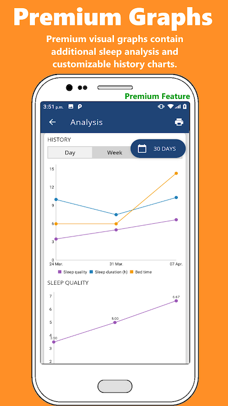 - Premium Visual Analysis mit detaillierten Aufschlüsselungen von Schlafenszeit, Schlafqualität und -dauer nach Wochentag und umfassender Schlafhistorie.