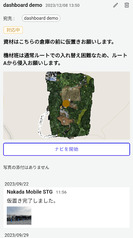 Sie können den neuesten digitalen Zwilling vor Ort, der mit Smart Construction Dashboard erstellt wurde, auf Mobilgeräten teilen. Anmerkungen können frei auf dem digitalen Zwilling platziert und als Arbeitsanweisungen von Vorgesetzten und Berichte von Mitarbeitern vor Ort mit dem Personal vor Ort geteilt werden (*1). Durch Angabe des Freigabeziels werden Benachrichtigungen in Echtzeit gesendet.