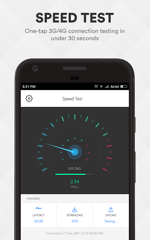 Measure the latency, download speed and upload speed of your mobile data connection and WiFi network with Speed Test. Also measure the network quality for regular browsing, watching streaming videos and video calling. Share test results with your friends to find out how your data connection compares to theirs.