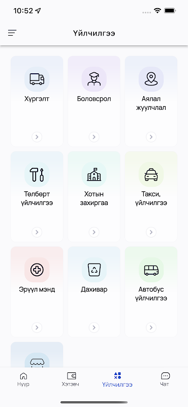 Dazu gehören Dienstleistungen wie das Rufen eines Taxis und der Lieferung, das Vereinbaren eines Arzttermins, das Bestellen Ihres Mülls, das Bezahlen Ihrer Wasser- und Heizrechnung und das Abrufen von Informationen über alle Servicezentren in Ihrer Nähe an einem Ort. Mit Hilfe dieser Anwendung können Sie auch Buslinien und Bushaltestellen in Ihrer Nähe anzeigen. Benutzer können über die Smart Erdenet-Anwendung miteinander chatten, und ein Zahlungssystem wird ebenfalls bereitgestellt. Auf diese Weise wurde eine komplexe Anwendung mit etwa 20 Diensten, die sich an Bürger richten, von den Einwohnern von Erdenet genutzt.
