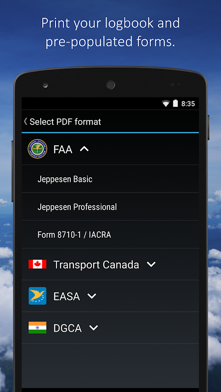 • Drucken Sie Ihr Flugbuch im Format Jeppesen Basic/Pro, Transport Canada, EASA oder DGCA (Indien).