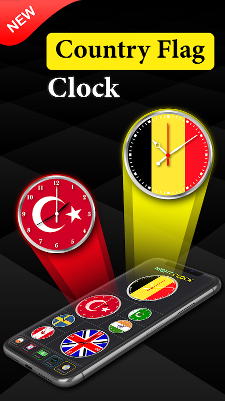 Wählen Sie aus einer Vielzahl von Country Clock Flags Ihren Favoriten. Platzieren Sie Ihren Favoriten auf Ihrem Mobilgerät. Sie werden nie eine leistungsstärkere Landuhr-App für den Sperrbildschirm finden als Smart Neon Clock Night Clock.