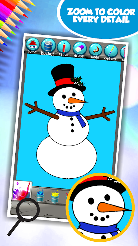 Entdecke das Kind in dir mit der großartigen Sammlung der wunderschönen Illustrationen. Sie sind nur einen Klick entfernt von Ihnen. Also zögern Sie nicht, aber laden Sie kostenlos die neueste Schneemann Coloring Book App. Es wird dir das Glück und die Freude bringen, die du nur während der Winterferien fühlst. Gehen Sie nach draußen und atmen Sie die frische Luft. Es ist nicht gesund, den ganzen Tag zu Hause zu bleiben, also kümmere dich nicht um die Kälte und schritt nach draußen. Die weiße Decke, die die Straße bedeckt, wird die süßesten Erinnerungen an Ihre Kindheit hervorrufen, wenn Sie es genossen haben, Schneebälle mit Ihren Freunden zu werfen. Es gab auch einen Wettbewerb, der den besten Schneemann machen wird und du versuchst zu gewinnen. Holen Sie sich die Top-Zeichnungen von ihm und versuchen, das Meisterwerk von ihnen zu schaffen. Verwenden Sie Ihre Phantasie, während Sie auf die Farbe Eimer klicken und wählen Sie eine der brillanten Schattierungen dort für Ihr Bild. Teilen Sie es dann mit all Ihren Freunden und sie werden grün mit Neid sein, wenn sie die bezaubernde Schönheit sehen, die hinter den Illustrationen liegt. Mit der neuesten Schneemann Färbung Anwendung auf Ihrem Handy haben Sie Tonnen von Spaß.