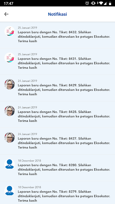 Laporan yang masuk dari pelapor akan memberikan notifikasi secara langsung. Petugas dapat segera memperbarui status atau menunjukan laporan ke eksekutor terkait.