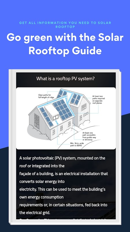 Gehen Sie umweltfreundlich mit der Solar Rooftop Guide App! Holen Sie sich alle Informationen, die Sie brauchen, um auf Solarenergie umzusteigen und einen positiven Einfluss auf die Umwelt zu haben. Unsere App bietet detaillierte Anweisungen zur Installation einer Solaranlage auf dem Dach. Mit leicht verständlichen Illustrationen können Sie den Prozess der Umstellung auf Solarenergie leicht verstehen. um maximale Effizienz und Langlebigkeit zu gewährleisten. Egal, ob Sie Hausbesitzer, Geschäftsinhaber oder einfach daran interessiert sind, grün zu werden, die Solar Rooftop Guide-App ist die perfekte Ressource für Sie. Laden Sie jetzt The Solar Rooftop Guide herunter und schließen Sie sich der Solarrevolution an!