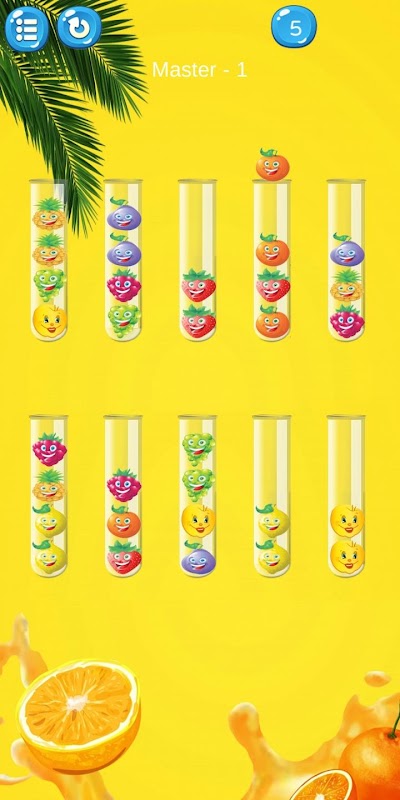 Sort the Fruit in the tube until all the Fruit are grouped to the same type. You will need to sort the Fruit like a ball into the same tube to win the level.