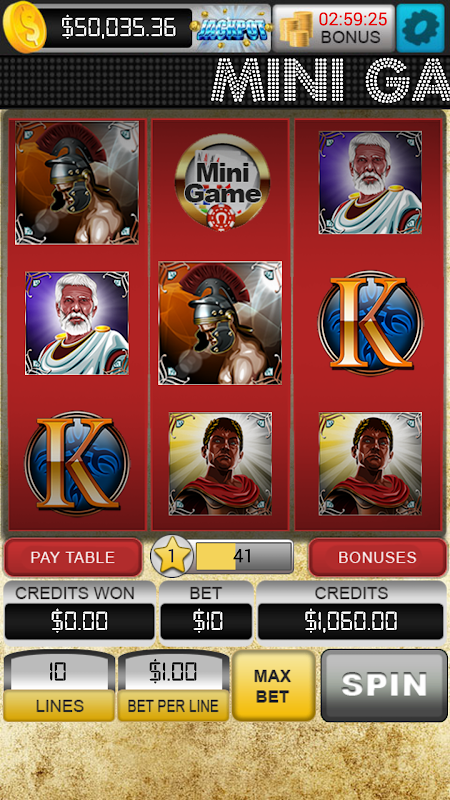 slot machine. Bet the max credits at a time and win big on this virtual slot machine! Spartan Slots offers a fantastic and super addictive mini game that allows you to spin on the wheel while trying to avoid the bombs which will allow you to add thousands of credits to your account. Also every 3 hours you will get a random bonus. Virtual casino has never been so fun!