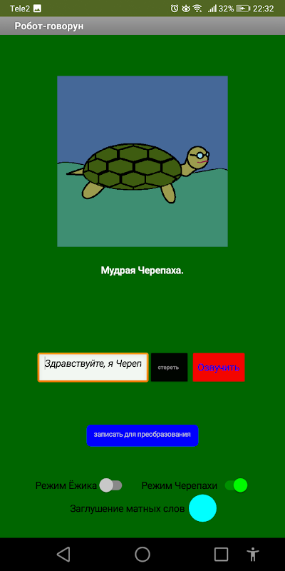 Sie können den Text mit der Stimme einer Figur aus der Zeichentrickserie "Smeshariki" sprechen. Die Stimme ähnelt der Stimme des Charakters nicht ganz genau, aber die Ähnlichkeit ist deutlich zu spüren.
