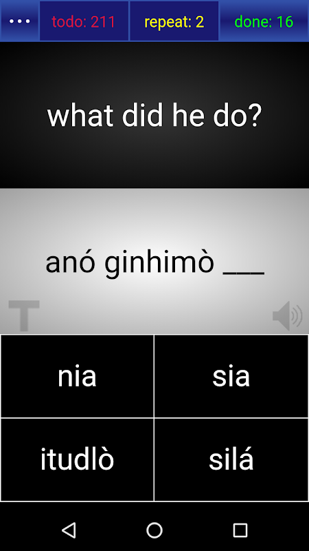 Die App ermöglicht es Benutzern, jeden Satz durch Ausprobieren zu lernen. Ihnen wird eine englische Übersetzung gezeigt und sie werden beauftragt, die entsprechende Ilonggo-Phrase Wort für Wort zu erstellen. Wenn sie einen Fehler machen, wird die Phrase automatisch in einen "Wiederholungs" -Stapel gelegt, und sie erhalten einige Zeit später eine weitere Chance, es erneut zu versuchen, bis sie es richtig verstanden haben.