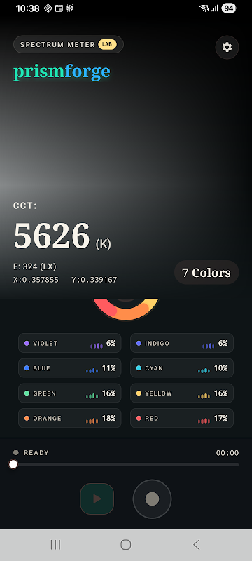 Prismforge Spectrum Meter verwandelt Ihr Android-Smartphone in ein Echtzeit-Lichtanalysetool. Messen Sie die korrelierte Farbtemperatur (CCT), die CIE-1931-Koordinaten (x,y), den Farbton und eine ungefähre Spektralverteilung mit der Kamera sowie die Umgebungshelligkeit (Lux) mit dem Lichtsensor des Geräts.