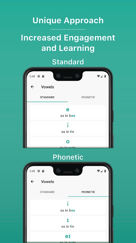 •Wechseln Sie zwischen 3D-Animationen oder Röntgenbildern für alle Laute im englischen phonetischen Alphabet