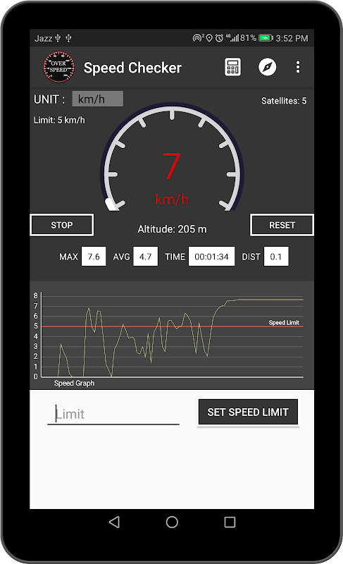 Geschwindigkeitsmesser, der die Geschwindigkeit eines Fahrzeugs in km / h (Kilometer pro Stunde) misst. Sie können diese Geschwindigkeitstest-App in Sekundenschnelle verwenden. Sie ist sehr einfach und benutzerfreundlich. Sie müssen lediglich die Höchstgeschwindigkeit eines Fahrzeugs einstellen. Die App hilft Ihnen und warnt Sie, wenn Sie die von Ihnen eingestellte Höchstgeschwindigkeit erreichen. Dieser Tacho gibt Ihnen eine Audio-Meldung „Verlangsamen“, um Ihre Geschwindigkeit zu verlangsamen, wenn Sie Ihr Limit überschreiten. Diese Geschwindigkeitstest-App warnt auch durch den Tachozeiger, der in Richtung Rot anzeigt. Dies wird nur angezeigt, wenn Sie das Tempolimit des Fahrzeugs überschreiten hat auch eine Kompassfunktion. Compass hilft Ihnen bei der Suche und beim Finden Ihrer Richtung und Grad von Norden.