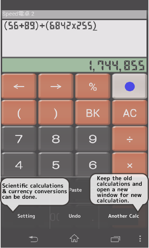 SpeedCalc zeigt das Ergebnis calc auf einmal. Calc ist angezeigt, wenn Sie Eingabe der Daten. Calc direkt Eingang des Verfahrens durch Antippen Calc Tippen Ergebnis zB * 1,5% BIN, OCT, HEX etc ※ 1.3.0 Calc Umrechnungskurs β Menü> Einstellungen für Währung verwenden, müssen Net