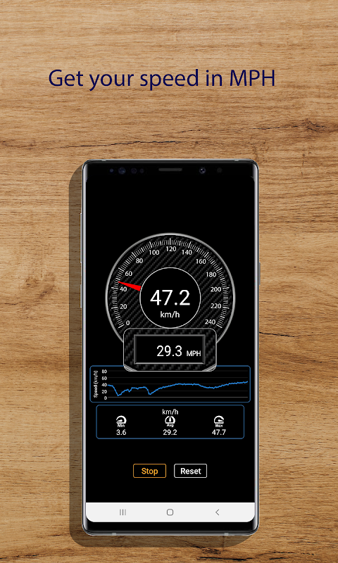 Der Geschwindigkeitsmesser misst die Geschwindigkeitsverschiebung des Benutzers mithilfe des Smartphone-GPS. Das Tachometer-GPS benötigt einen freien Platz, um eine angemessene Kommunikation mit den Satelliten zu haben, die das GPS bereitstellen. Die Daten werden auf dem Bildschirm des Geräts in analoger und digitaler Form angezeigt. Die App zeigt die Höchst-, Durchschnitts- und Mindestgeschwindigkeit in km/h an. Zusätzlich wird ein Diagramm der Geschwindigkeit des Benutzers angezeigt. Der Tachometer GPS kann so konfiguriert werden, dass er einen Alarm ausgibt, wenn eine vom Benutzer eingestellte Geschwindigkeit überschritten wird. Die Geschwindigkeitseinheit wird in km/h und MPH angezeigt.