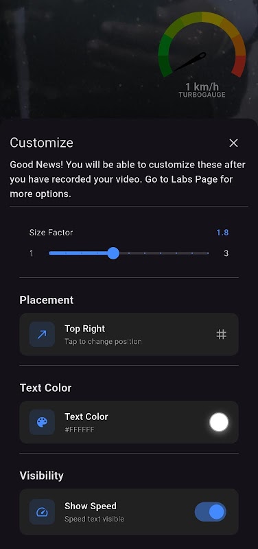 TurboGauge Tachometer mit Video-HUD ist eine leistungsstarke App, mit der Sie Ihre aktuelle Geschwindigkeit verfolgen oder Videos mit einem Echtzeit-Tachometer-Overlay aufnehmen können. Ganz gleich, ob Sie Auto fahren, Fahrrad fahren oder Actionsport betreiben, mit dieser App können Sie Ihre Geschwindigkeitsdaten direkt in Ihren Videos erfassen.