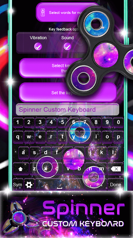 ✜ It's your time to shine, and there's no better way to do that then to use this amazing ✱ Spinner Custom Keyboard✱! Now you can adorn your keypad background by selecting colorful spinner images, cool keypad sounds, fonts and much more! Add your fave spinner wallpaper, select the key style you like the most and start a typing challenge! Now it's possible to type fast and accurate thanks to our built-in spell checker and auto-correction option. spinner games are conquering the app market, but don't underestimate “free keyboard apps” that are also inspired by these fantastic hand toys such as this one!