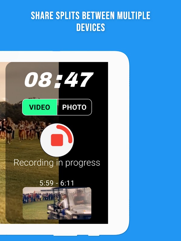 Mit Split Tracker können Sie mehreren Trainern Zeit geben und gleichzeitig Videos aufnehmen. Die App koordiniert bequem ihre Fotos und Videos, um während des Trainings oder eines Rennens genaue Zwischenzeiten zu erstellen. Verabschieden Sie sich von Stoppuhrkämpfen und begrüßen Sie nahtlose Teamarbeit!