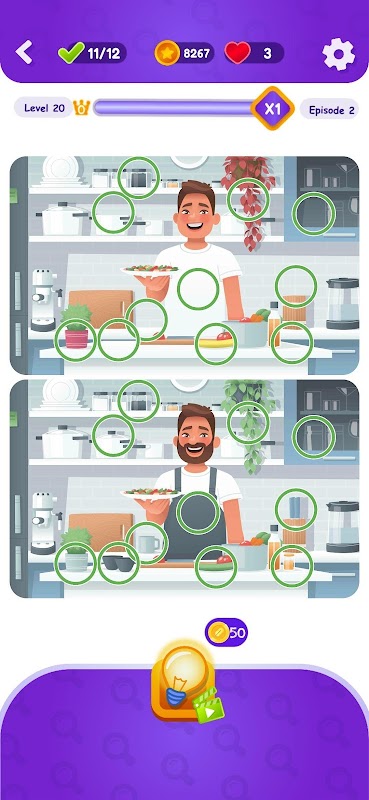 Utilize hints when you're stuck in the puzzle game and need assistance spotting the differences.