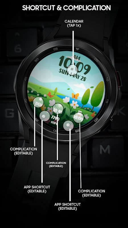 Digitales Zifferblatt mit Frühlingslandschaftsillustration. Für Wear OS Smartwatch. Besonderheit :