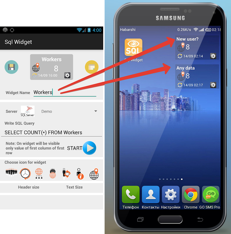 SQL Widget это простое и быстрое приложение для отображения любых данных c любых СУБД на виджете телефона.