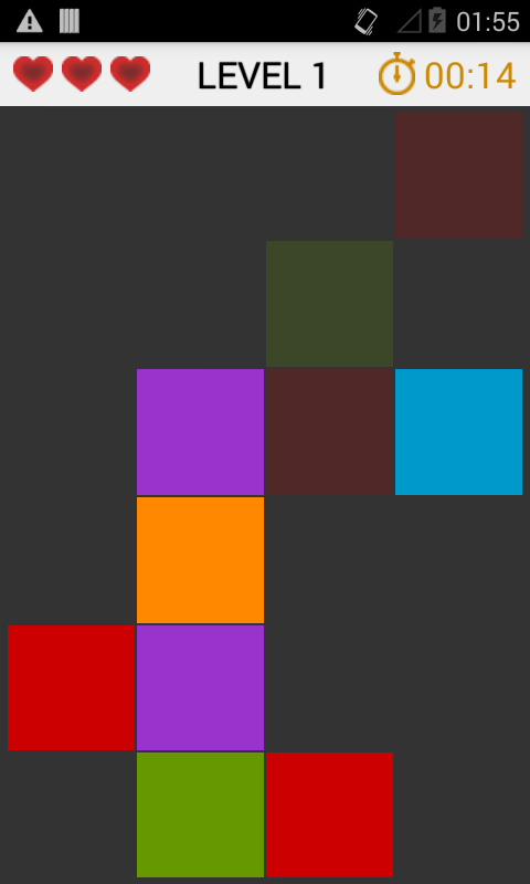 Progress though the levels of the puzzle matching squares of the same color to find out the photo underneath.