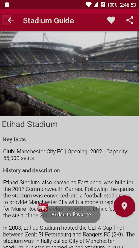Stadium Guide is a digital travel guide for football fans. Stadium Guide provides travel directions by road and rail to to the World's Football Stadiums. The app shows a map of the area around the stadium, and your location relative to the stadium.