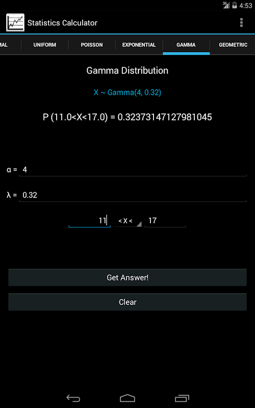 Einen Statistik-Kurs in der Schule oder Universität? Dann ist diese App für Sie werde auf jeden Fall wollen, Ihre Antworten zu überprüfen. Mit seiner reichen und leicht zu bedienende Benutzeroberfläche Statistik Calculator hilft Ihnen, Wahrscheinlichkeiten von Zufallsvariablen, die bestimmte Wahrscheinlichkeitsverteilungen folgen zu finden.