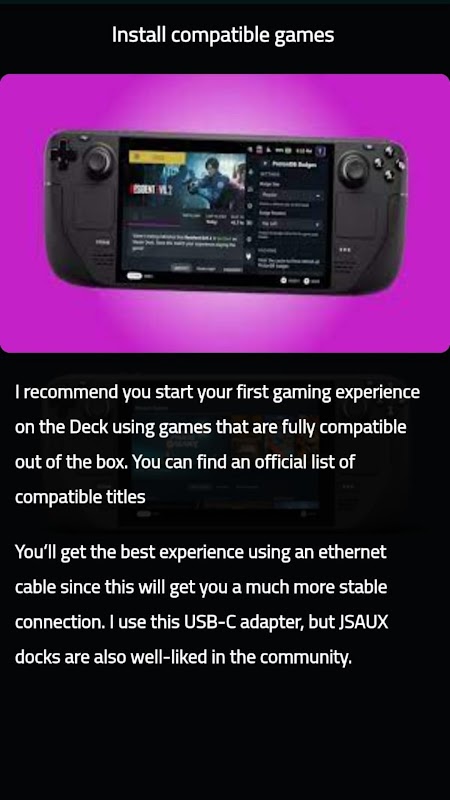 Die Steam Deck Guide-App bietet auch Informationen zu Zubehör und Peripheriegeräten von Drittanbietern, sodass Sie Ihr Spielerlebnis vollständig anpassen können. Egal, ob Sie nach einem neuen Controller, Headset oder anderem Zubehör suchen, die Steam Deck Guide-App hat alles, was Sie brauchen, um Ihr Spiel auf die nächste Stufe zu heben.