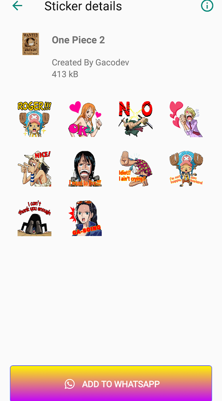 Setelah merilis wallpaper narruto kami dari gacodev akan merilis sebuah aplikasi dengan judul Sticker wa One Pieece lucu terbaru WAStickerApps Penasaran sticker lucu apa saja didalamnya??, Yuk segera miliki koleksi sticker WA ONE PIiECE terbaru dan terbaik yang pastinya bakal seru