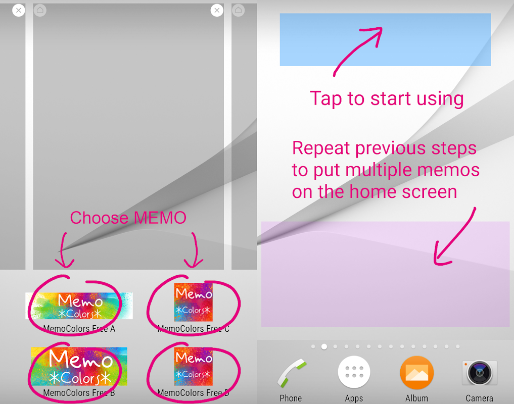 3. Berühren und halten Sie das Widget „Memofarben kostenlos“. Es werden Bilder der einzelnen Startbildschirme angezeigt.