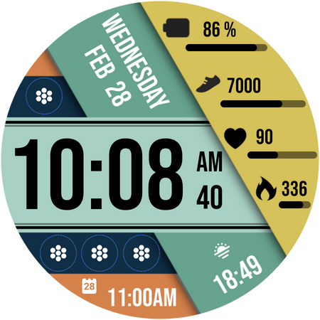 Einzigartig gestaltete Farben und informative Looks zusammen mit benutzerdefinierten Komplikationen – alles in einem Zifferblatt für Wear OS-Geräte!