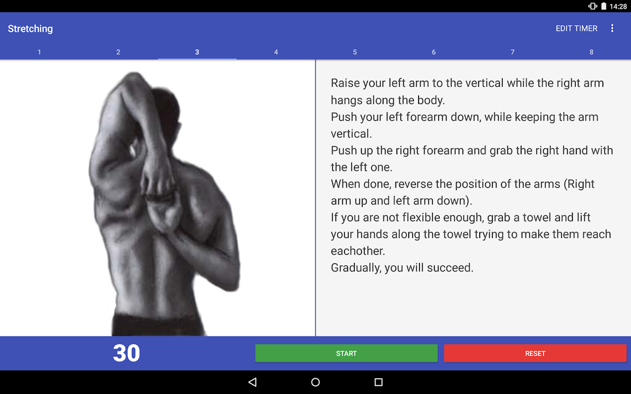 Stretching Flex provides many stretching exercises. By increasing the duration of each stretching exercise you can achieve great flexibility.